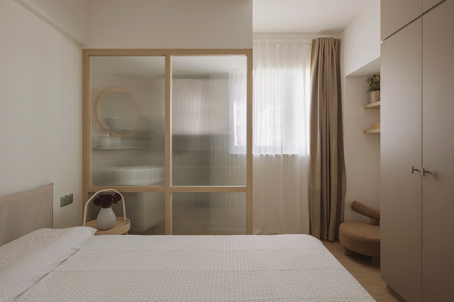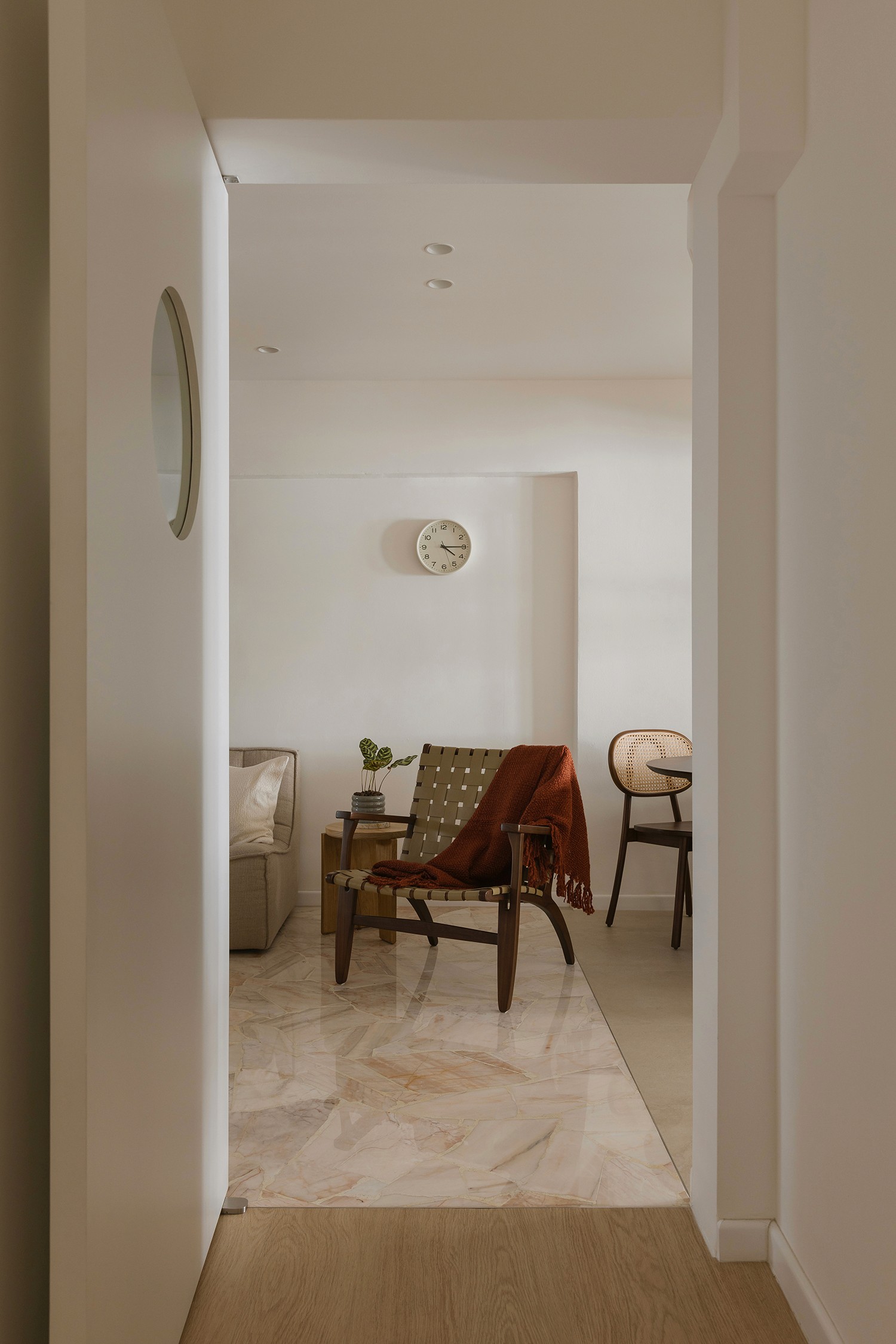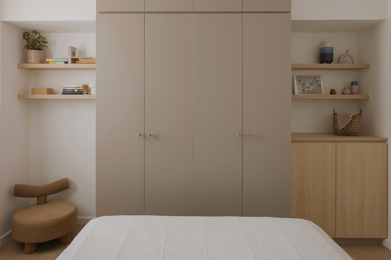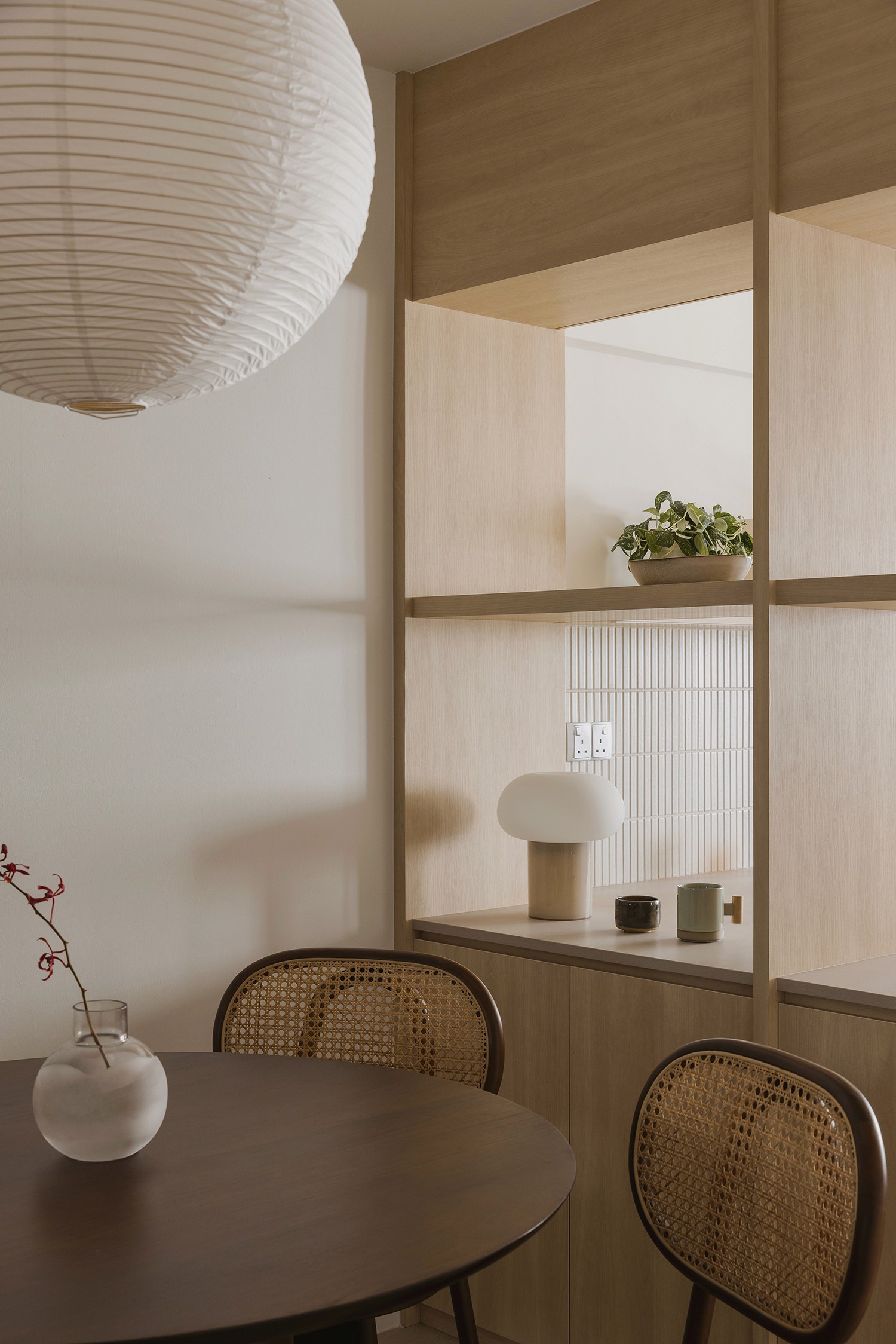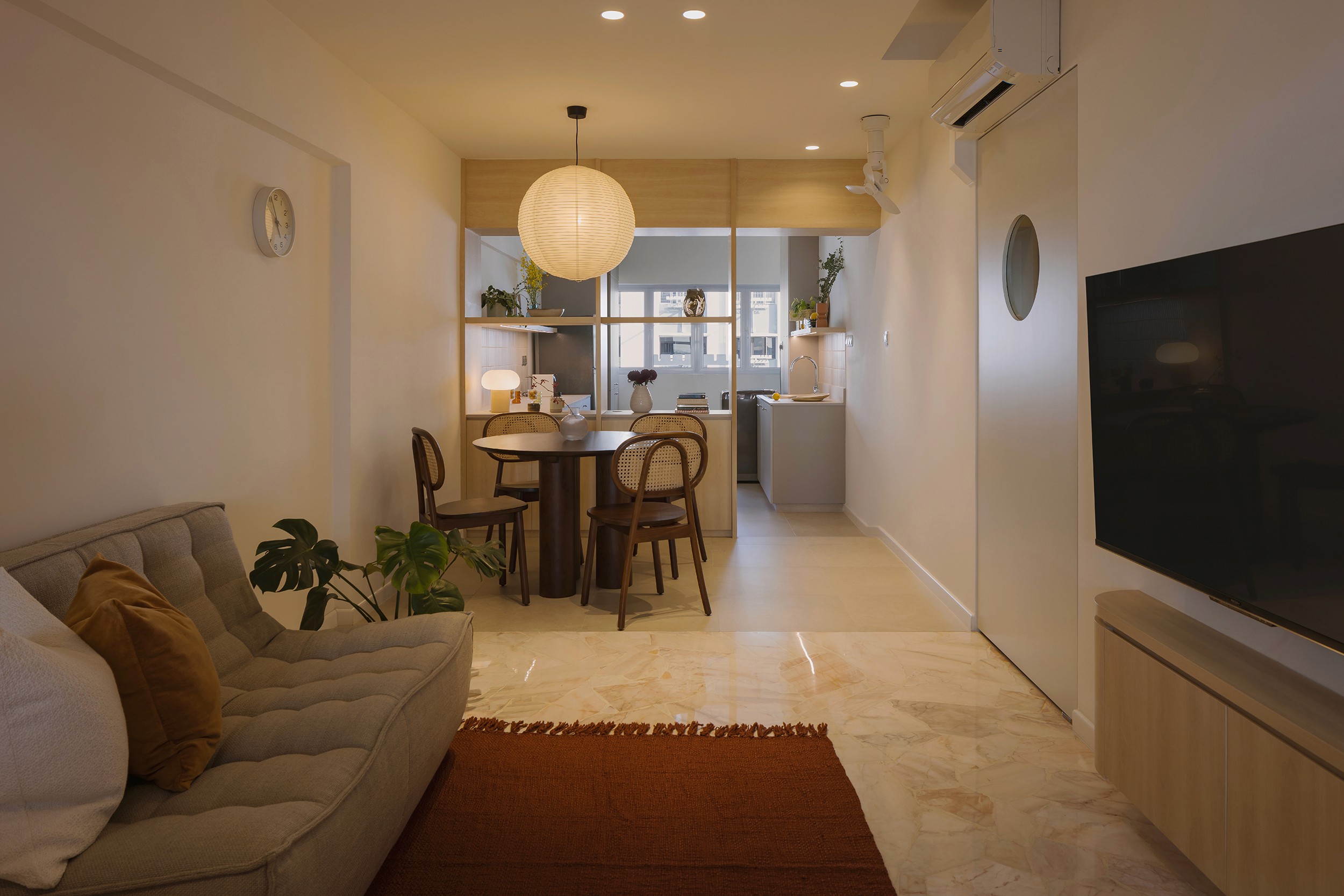 Bright and flushed with natural light, a once dark and dingy interior has been transformed into a cosy home designed for a daughter-and-mom duo. Major changes were made to the floor plan, removing several existing carpentry elements and walls that made the space feel smaller than it truly was. At the heart of the home is a built-in open shelf between the dining and kitchen, serving a dual purpose of offering both separation and openness. It provides a pleasant backdrop at the dinner table while clearly delineating the two spaces. The material palette features a soft layering of textures and colors - primarily light wood, off whites and warm greys - complementing the apartment’s character. The original pink marble floor was retained, sitting beautifully in the living room and adding a unique charm to the design.