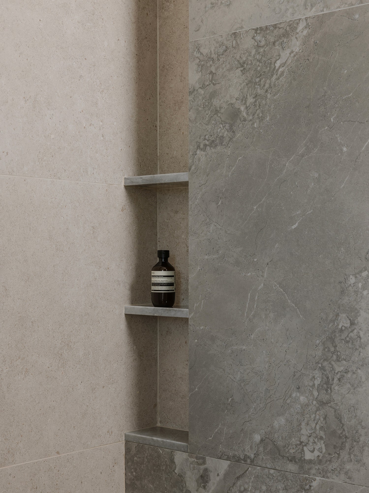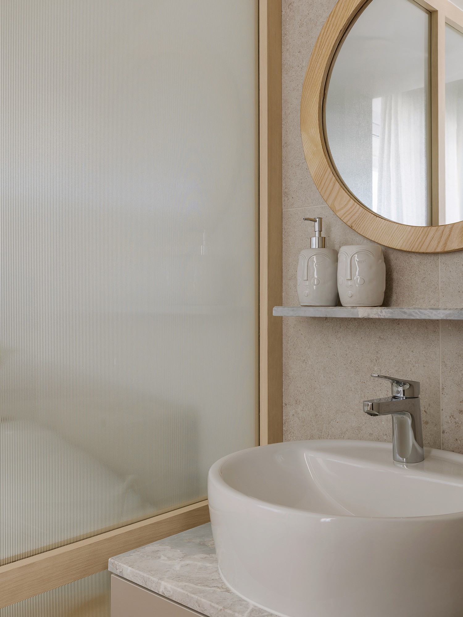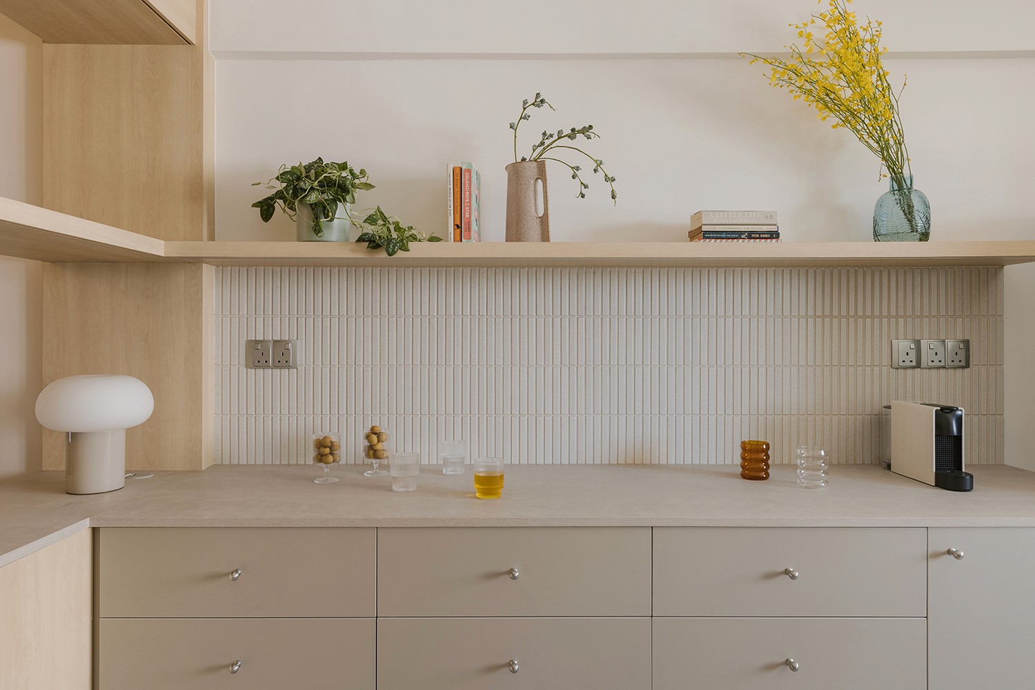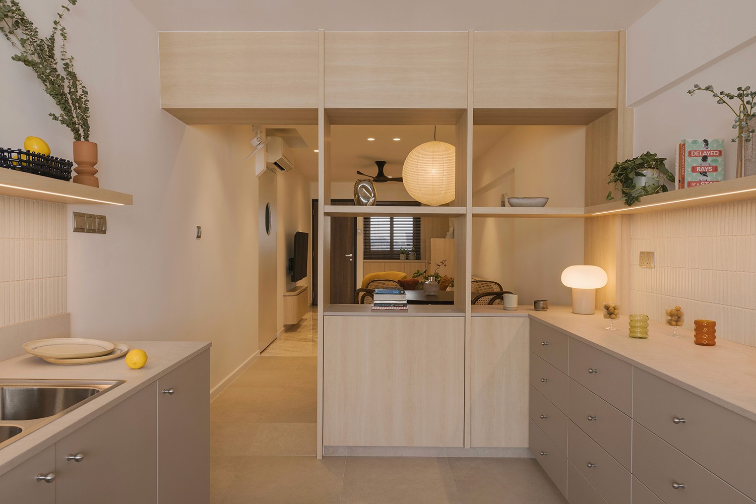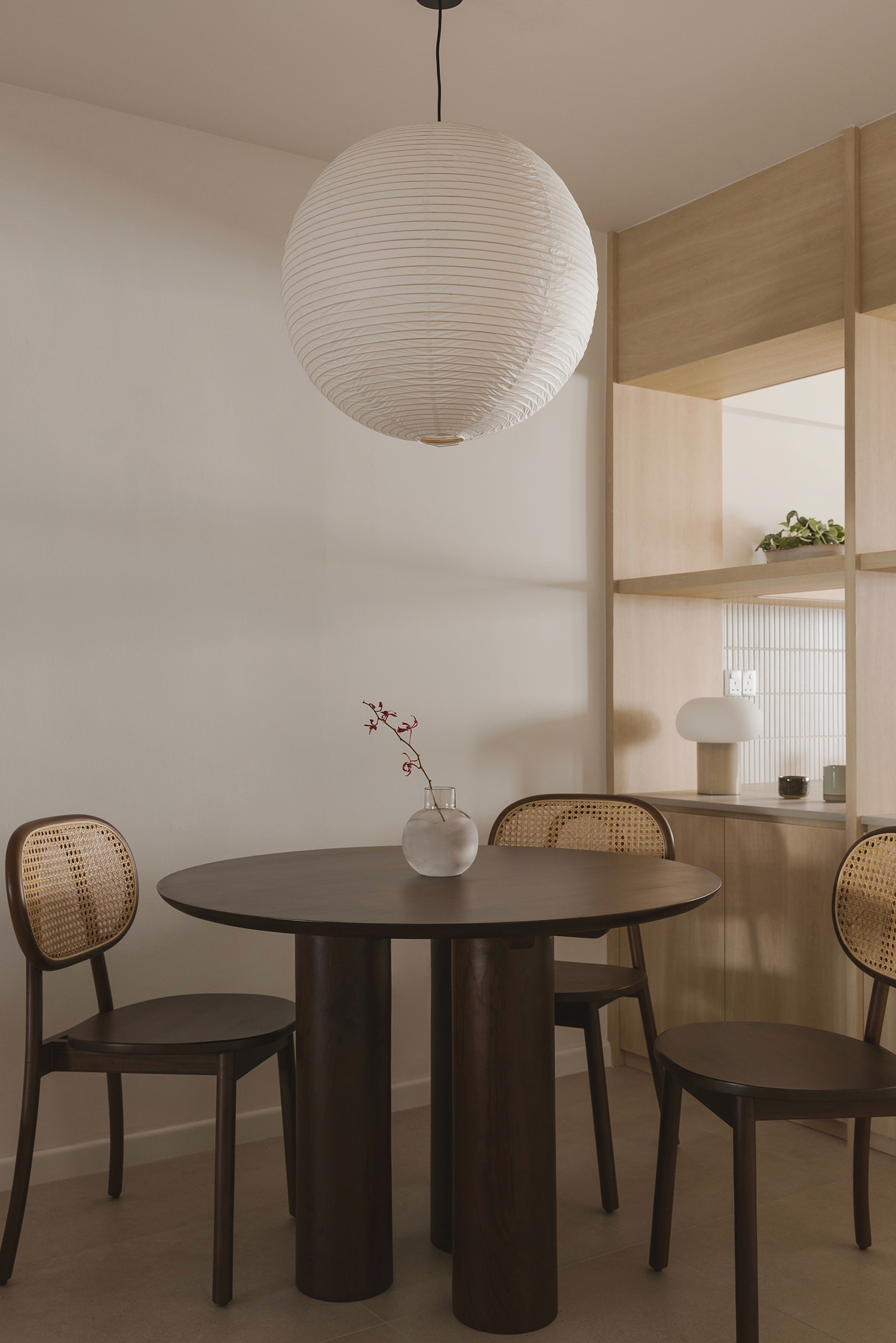 Bright and flushed with natural light, a once dark and dingy interior has been transformed into a cosy home designed for a daughter-and-mom duo. Major changes were made to the floor plan, removing several existing carpentry elements and walls that made the space feel smaller than it truly was. At the heart of the home is a built-in open shelf between the dining and kitchen, serving a dual purpose of offering both separation and openness. It provides a pleasant backdrop at the dinner table while clearly delineating the two spaces. The material palette features a soft layering of textures and colors - primarily light wood, off whites and warm greys - complementing the apartment’s character. The original pink marble floor was retained, sitting beautifully in the living room and adding a unique charm to the design.