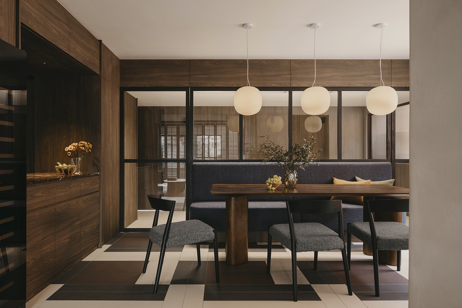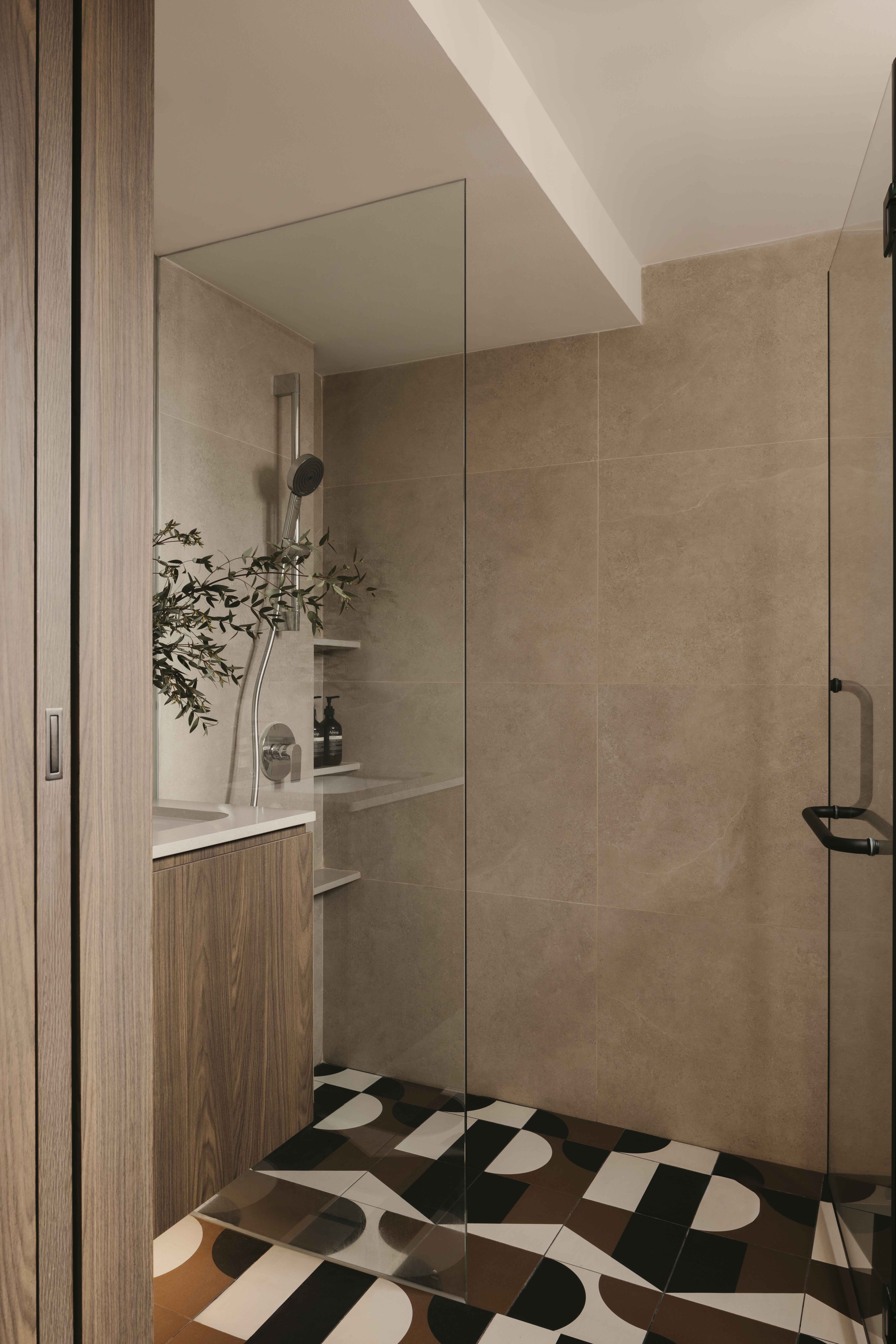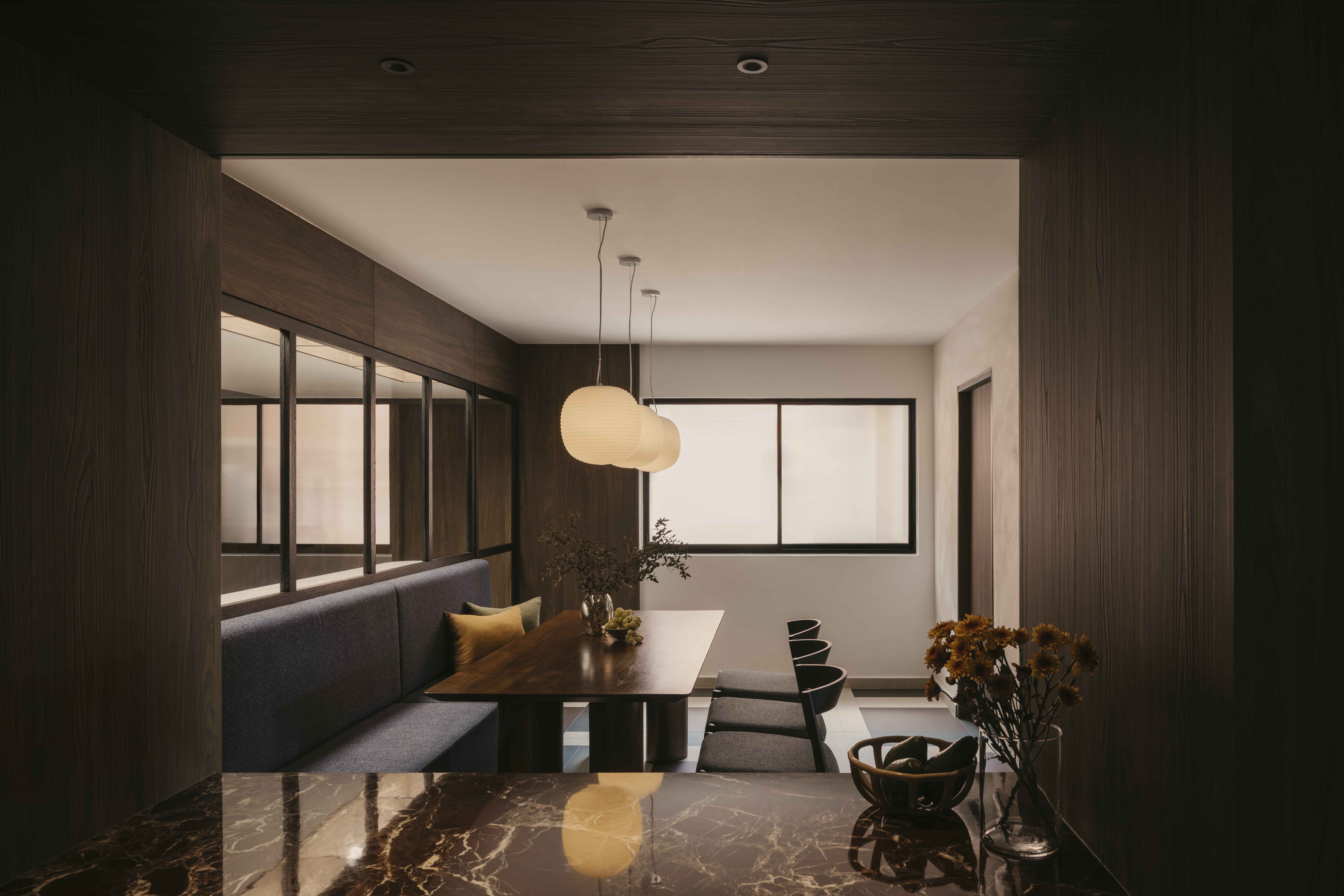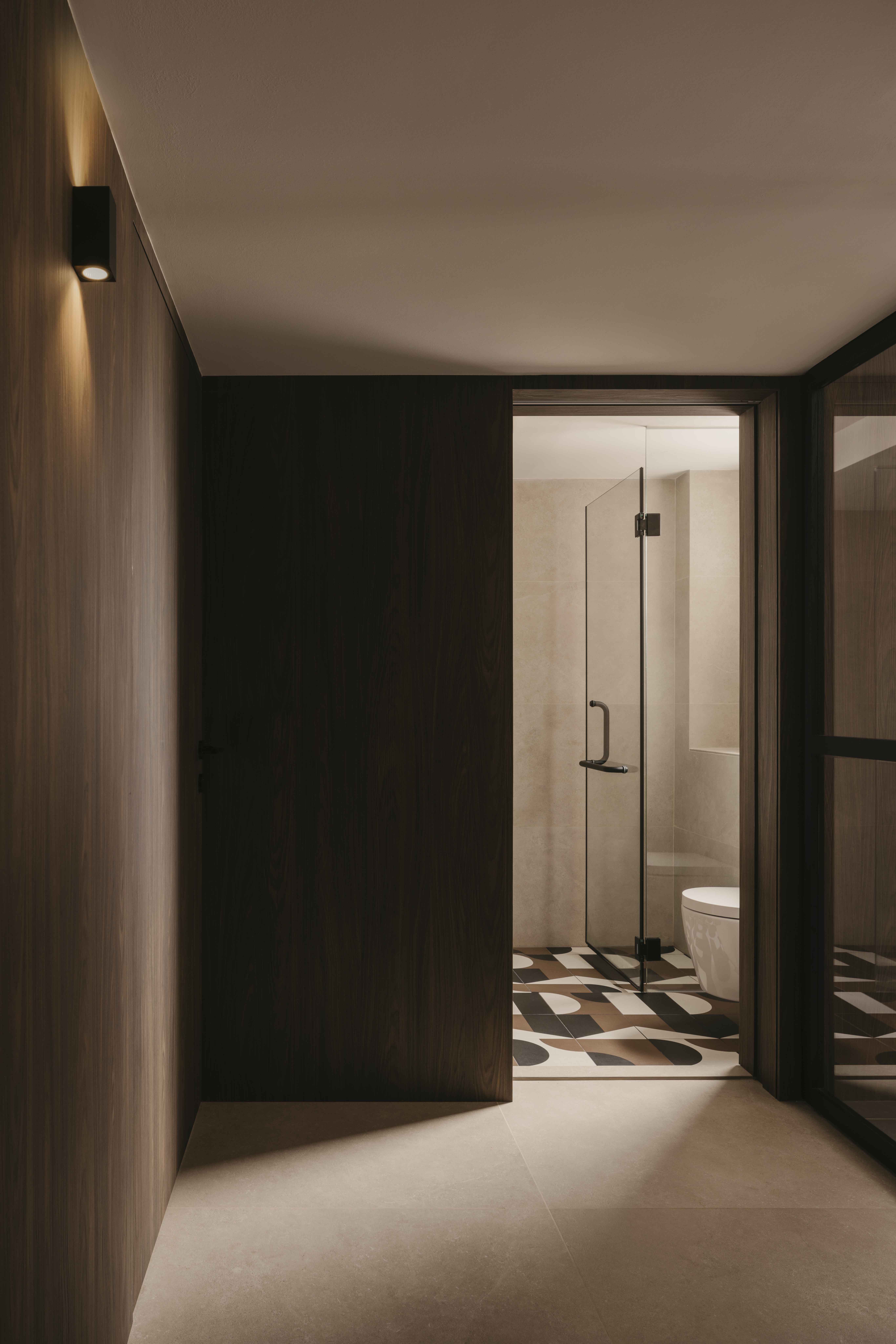 Built in the 1990s, this apartment was run-down but boasted a unique layout that was underutilized and dark. The internal layout was reimagined to create a central focal point—the dining room. Patterned tiles, arranged almost like a carpet, were used to demarcate this space, making it a standout feature visible from nearly every part of the home. Full-height glass panels provide a charming backdrop, perfect for hosting elegant dinner parties. A balcony with operable screens was added to the living area, helping to shield the space from the harsh western sun while offering a serene retreat. Patterns and colors were playfully incorporated throughout, with a feature red marble introduced in the foyer and master suite, adding a touch of elegance and maturity to the overall design.
