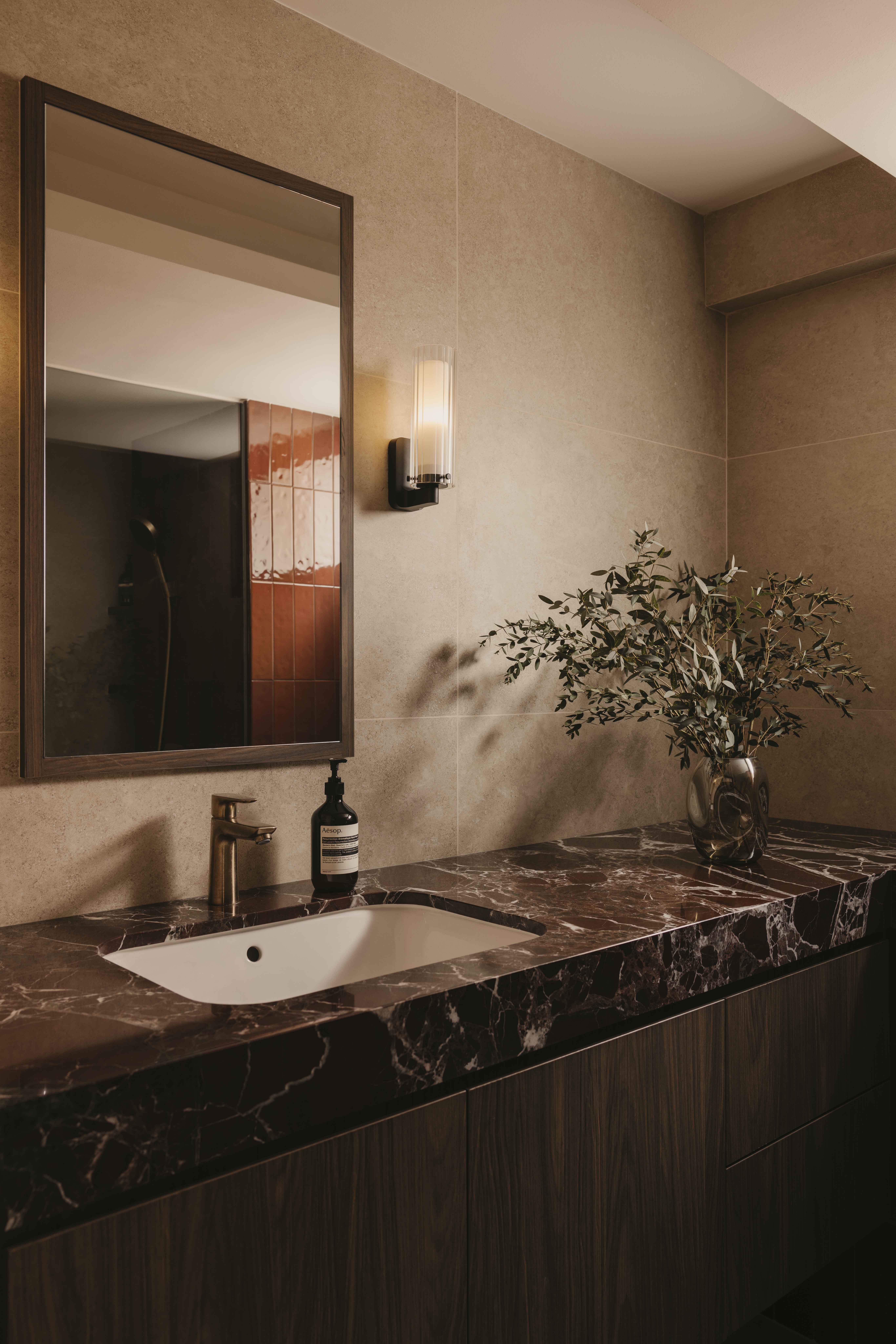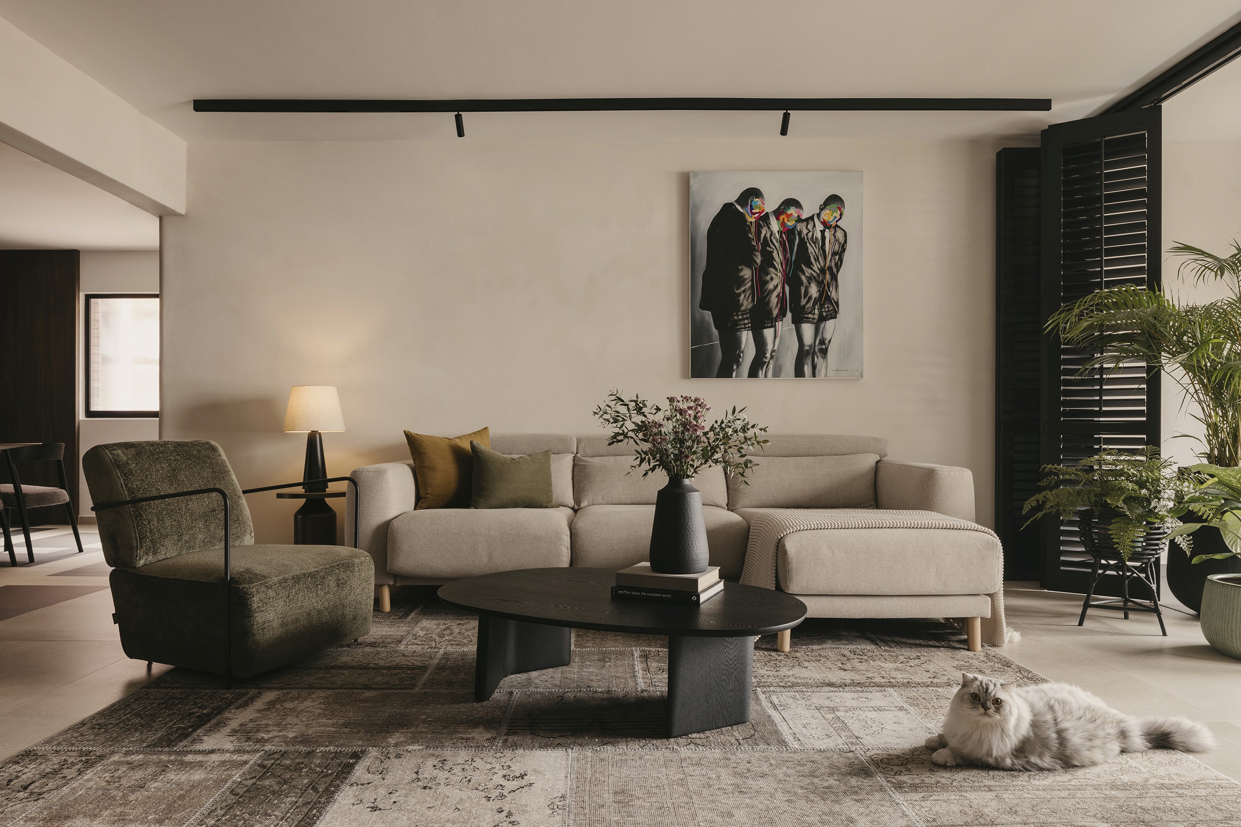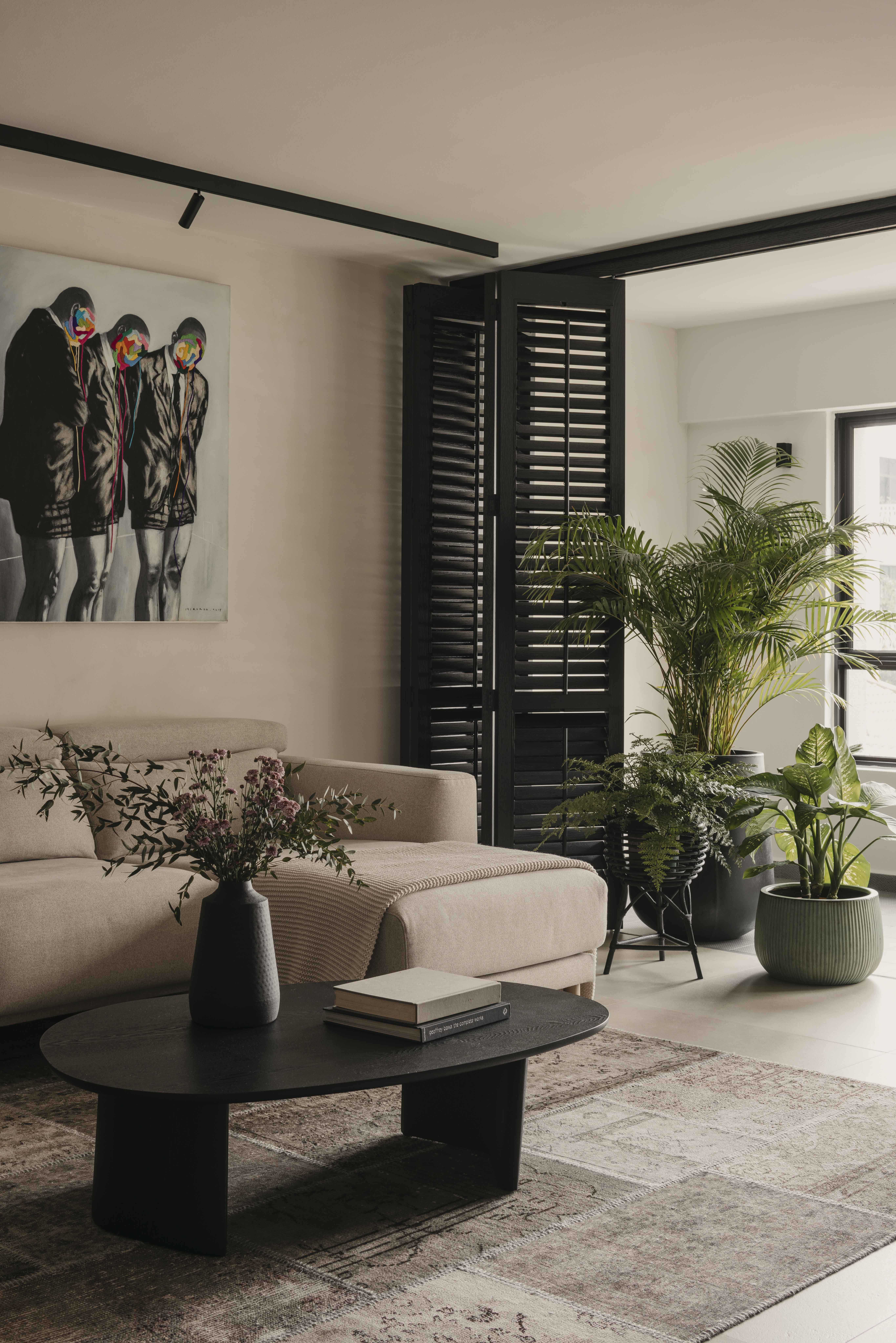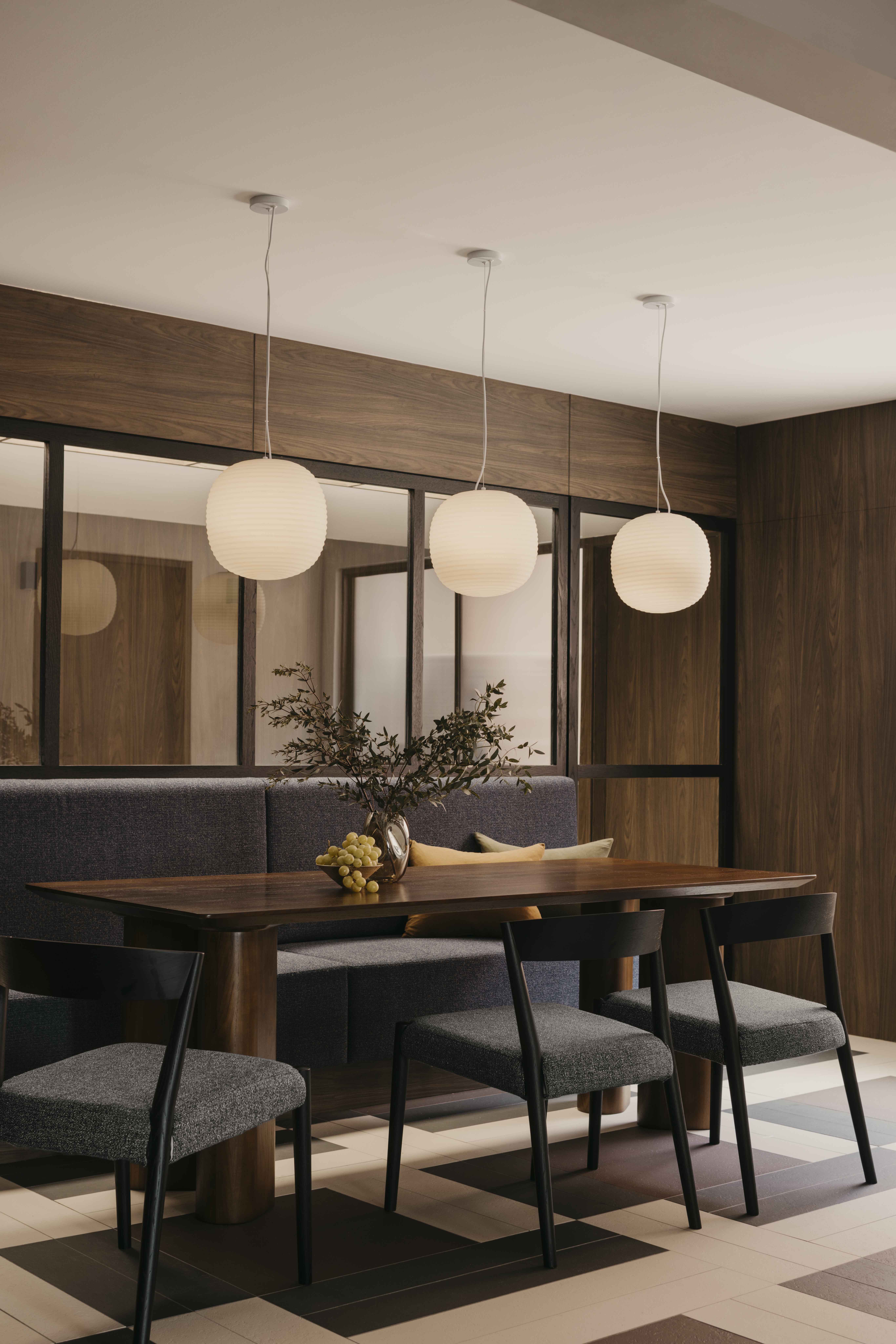 Built in the 1990s, this apartment was run-down but boasted a unique layout that was underutilized and dark. The internal layout was reimagined to create a central focal point—the dining room. Patterned tiles, arranged almost like a carpet, were used to demarcate this space, making it a standout feature visible from nearly every part of the home. Full-height glass panels provide a charming backdrop, perfect for hosting elegant dinner parties. A balcony with operable screens was added to the living area, helping to shield the space from the harsh western sun while offering a serene retreat. Patterns and colors were playfully incorporated throughout, with a feature red marble introduced in the foyer and master suite, adding a touch of elegance and maturity to the overall design.