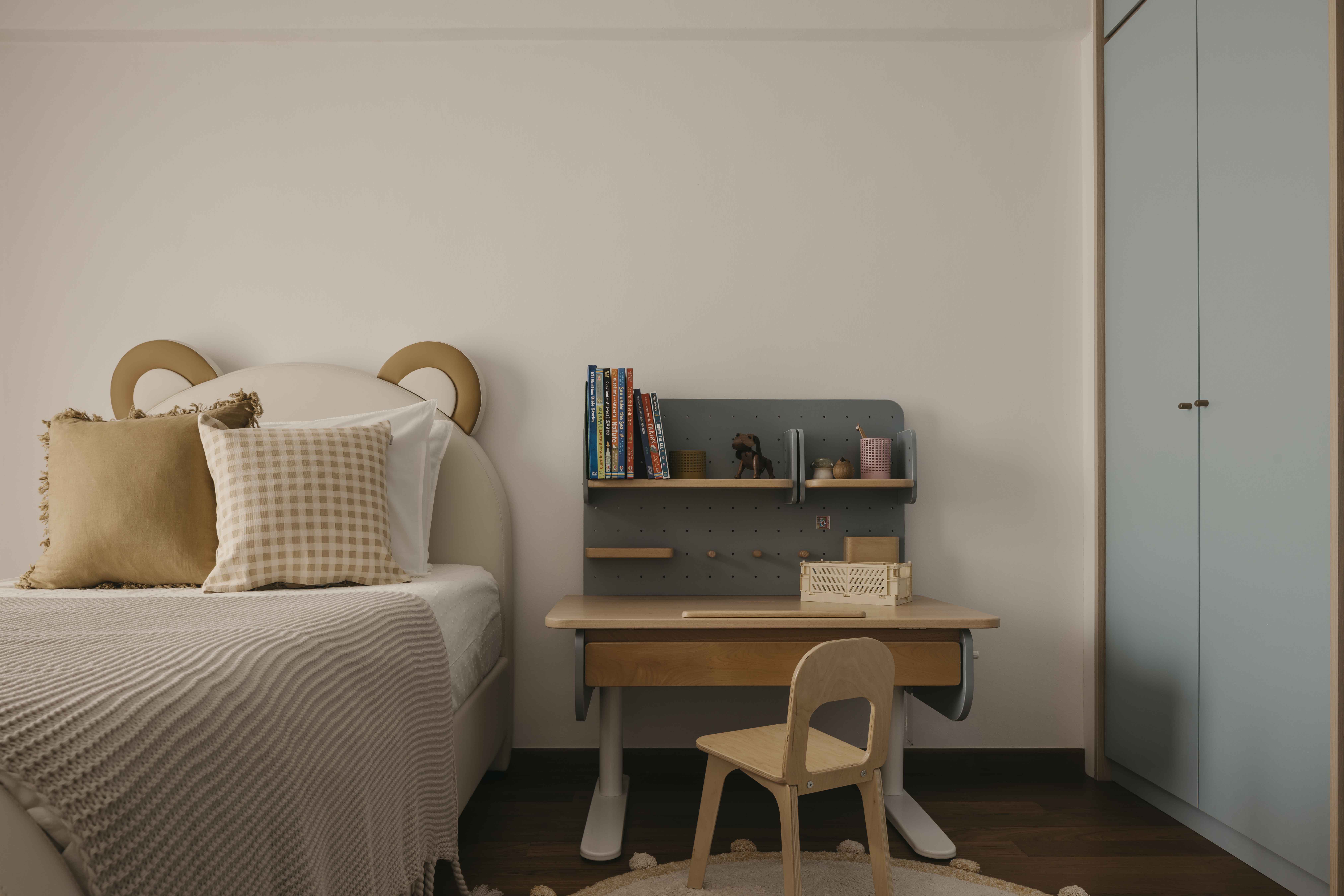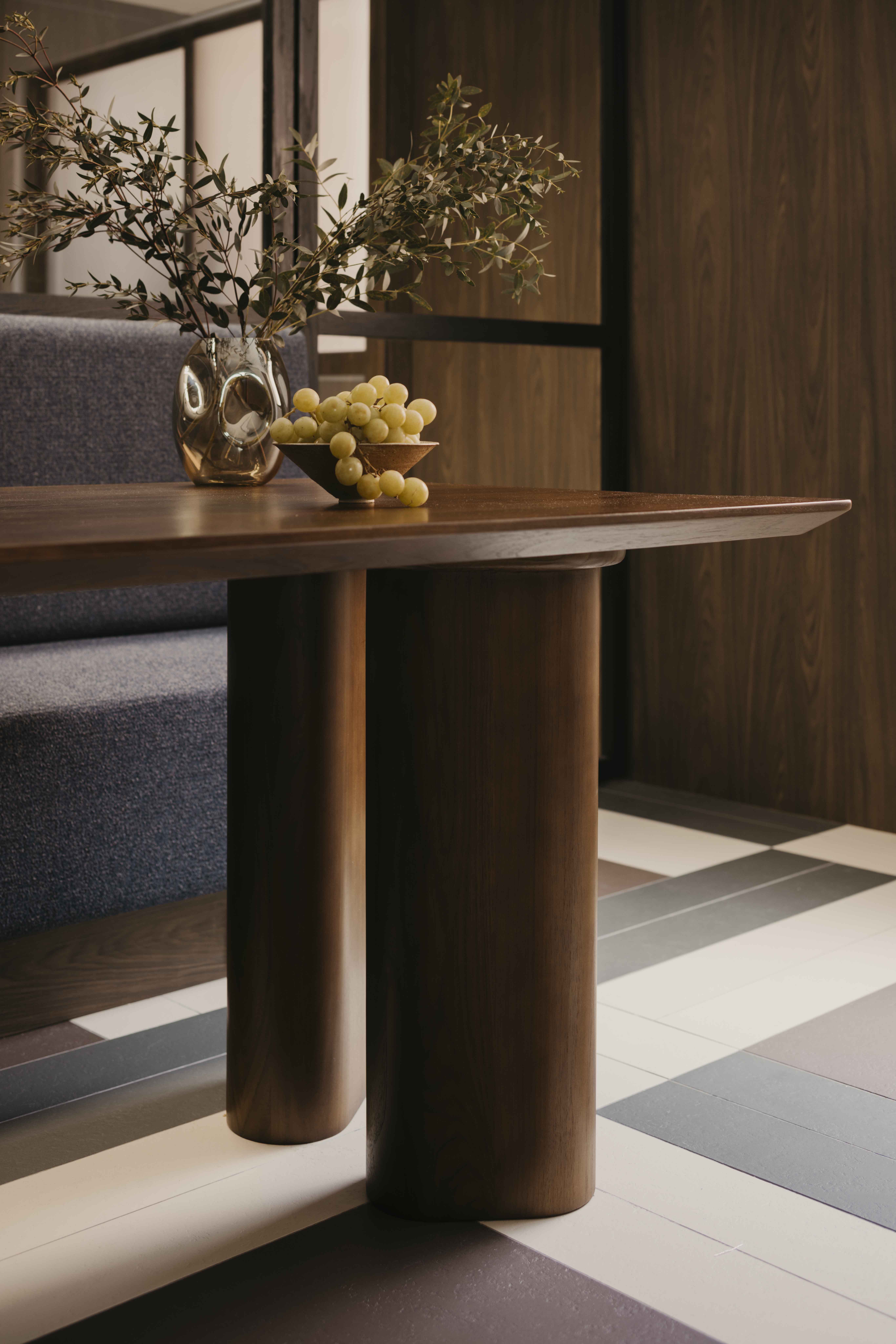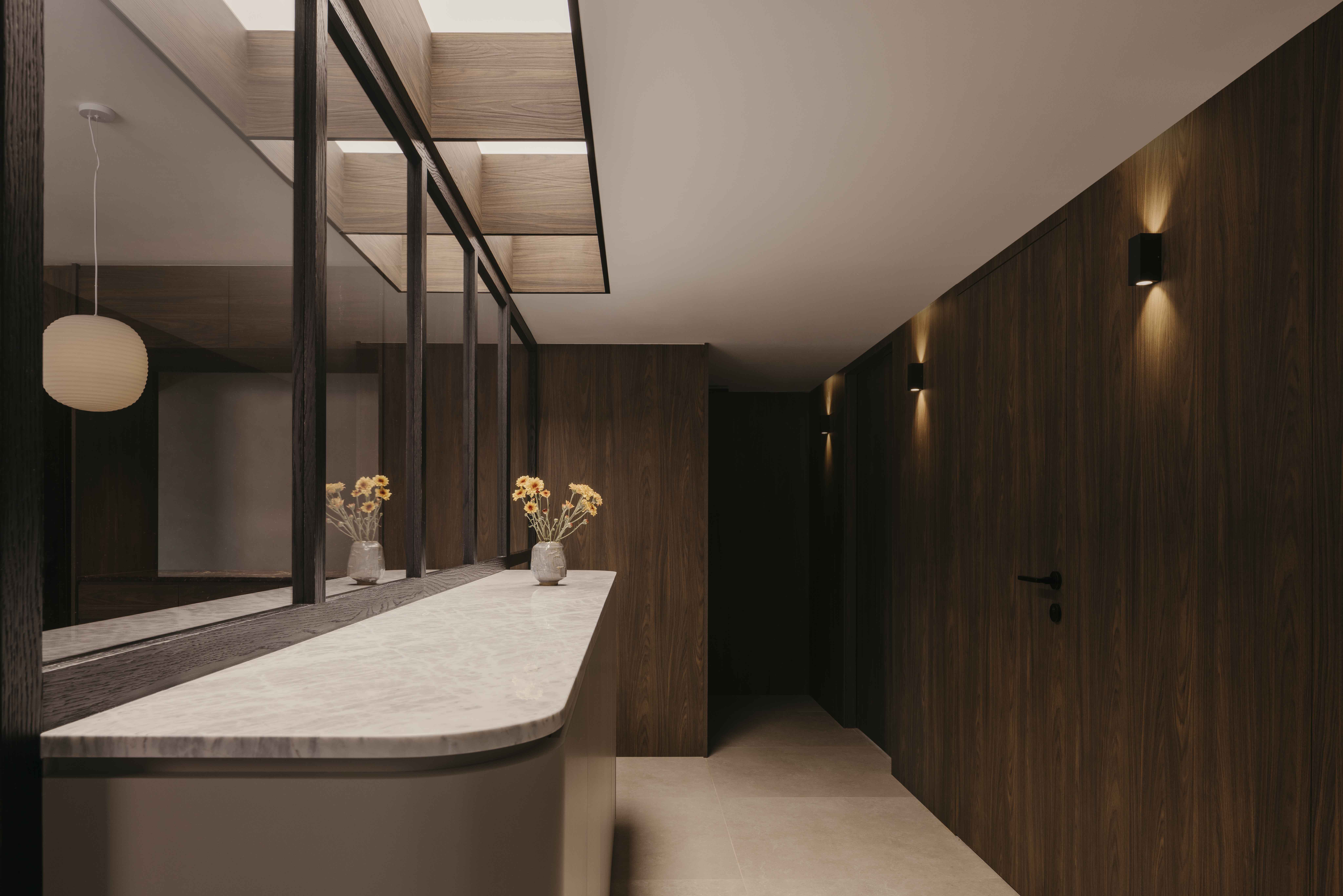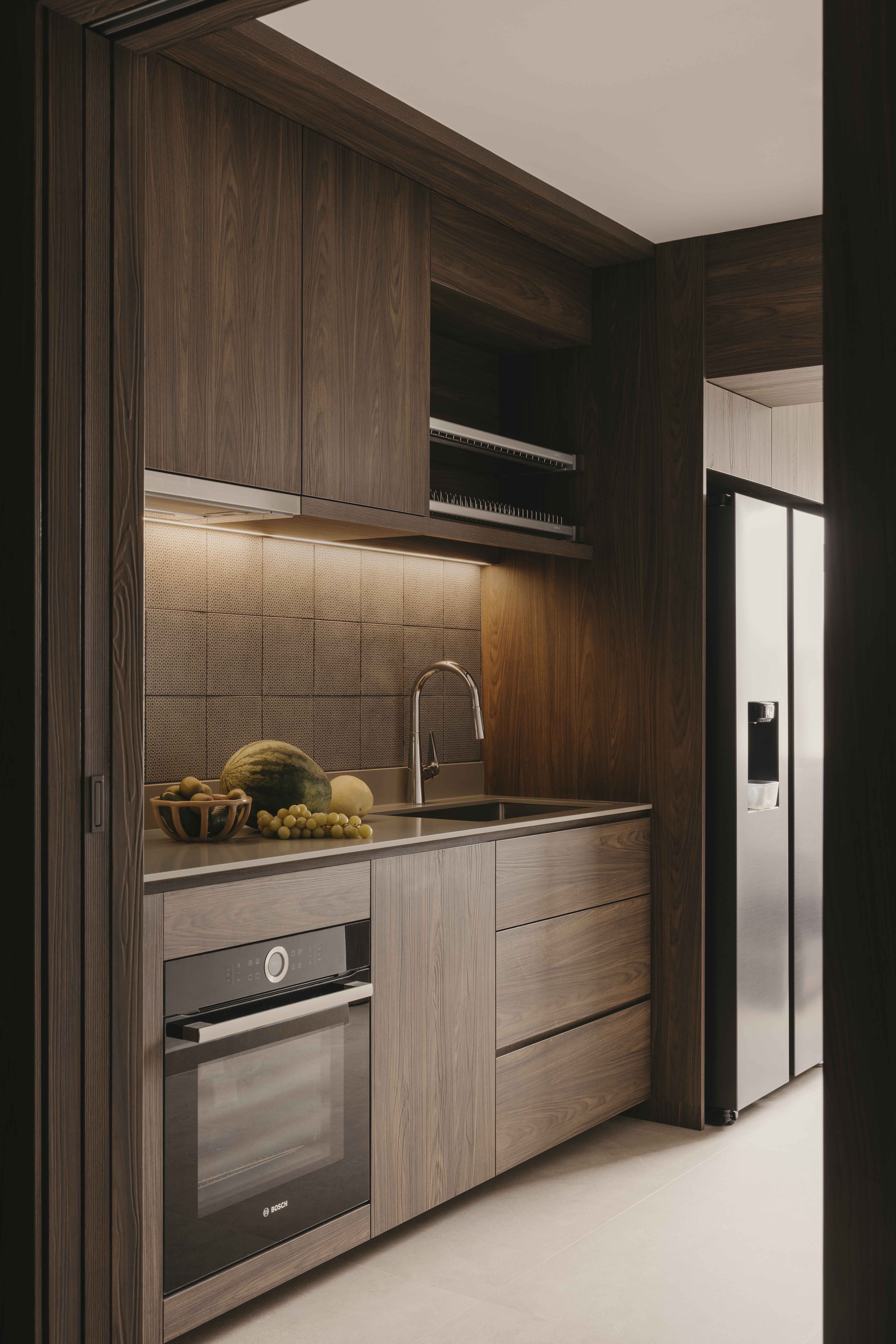 Built in the 1990s, this apartment was run-down but boasted a unique layout that was underutilized and dark. The internal layout was reimagined to create a central focal point—the dining room. Patterned tiles, arranged almost like a carpet, were used to demarcate this space, making it a standout feature visible from nearly every part of the home. Full-height glass panels provide a charming backdrop, perfect for hosting elegant dinner parties. A balcony with operable screens was added to the living area, helping to shield the space from the harsh western sun while offering a serene retreat. Patterns and colors were playfully incorporated throughout, with a feature red marble introduced in the foyer and master suite, adding a touch of elegance and maturity to the overall design.