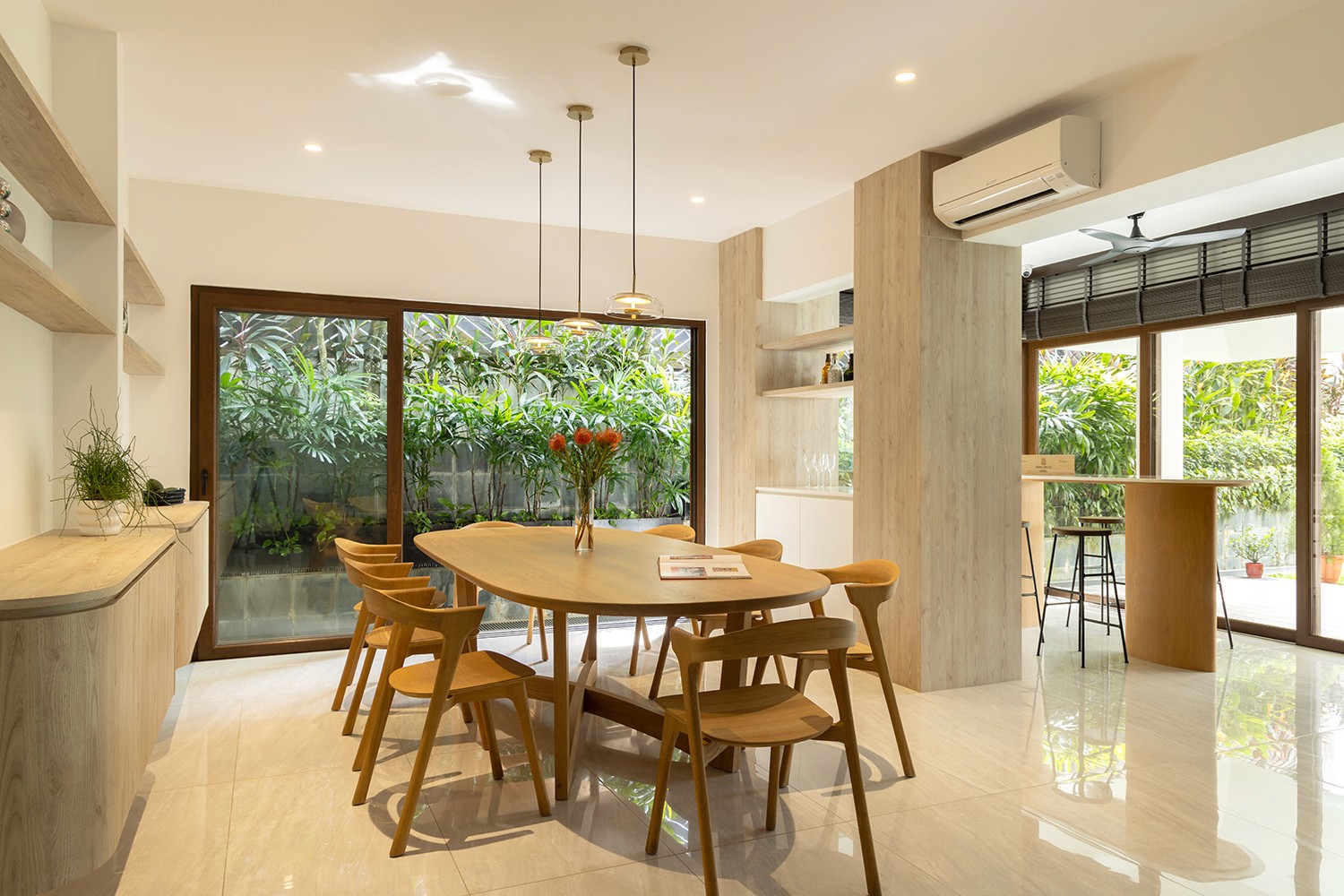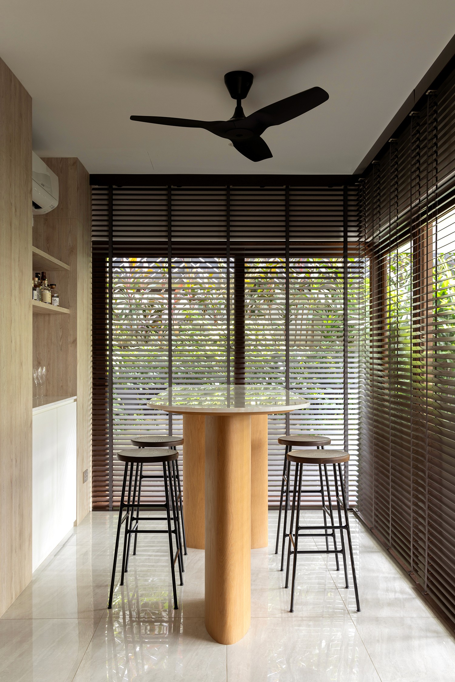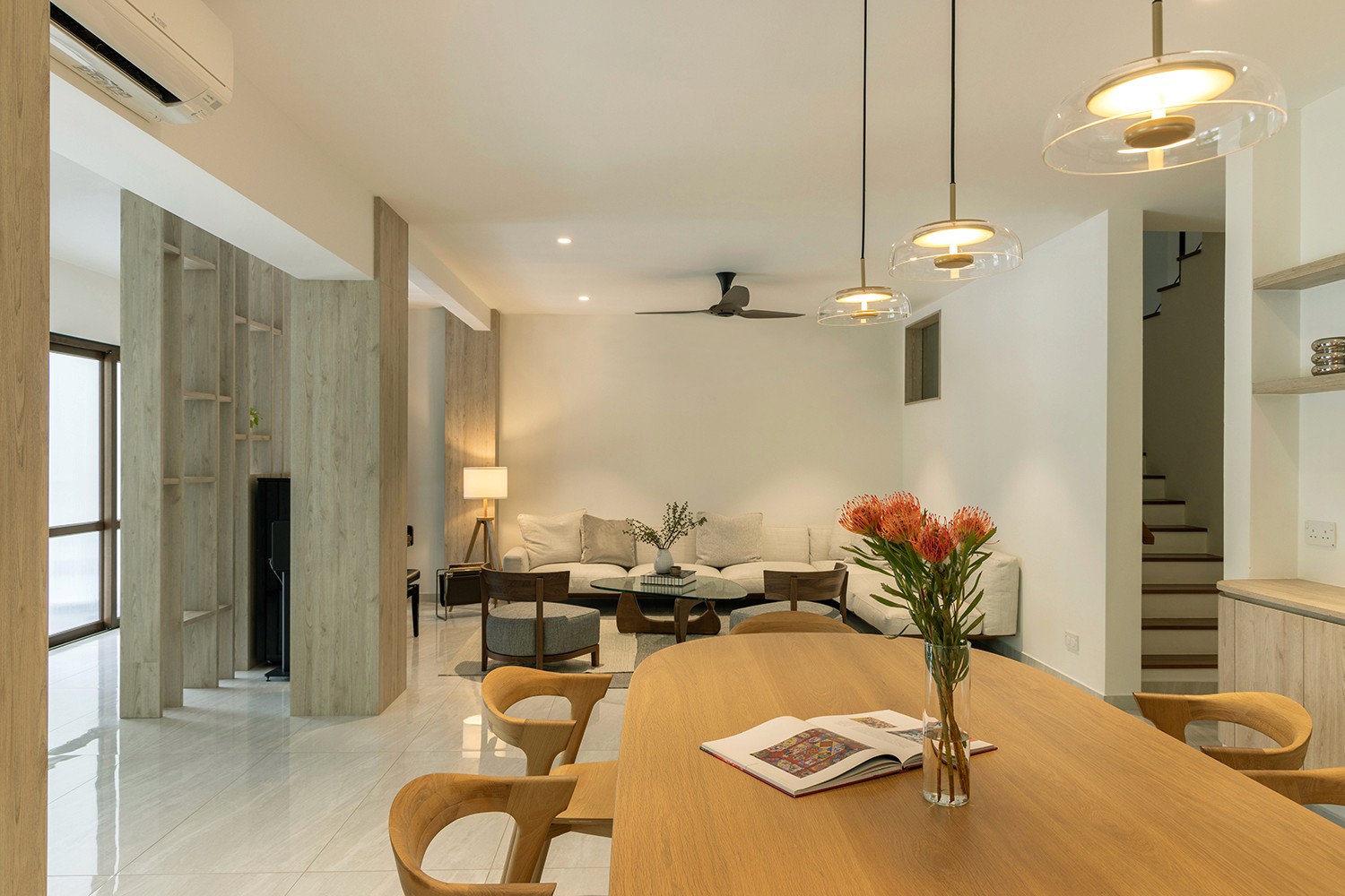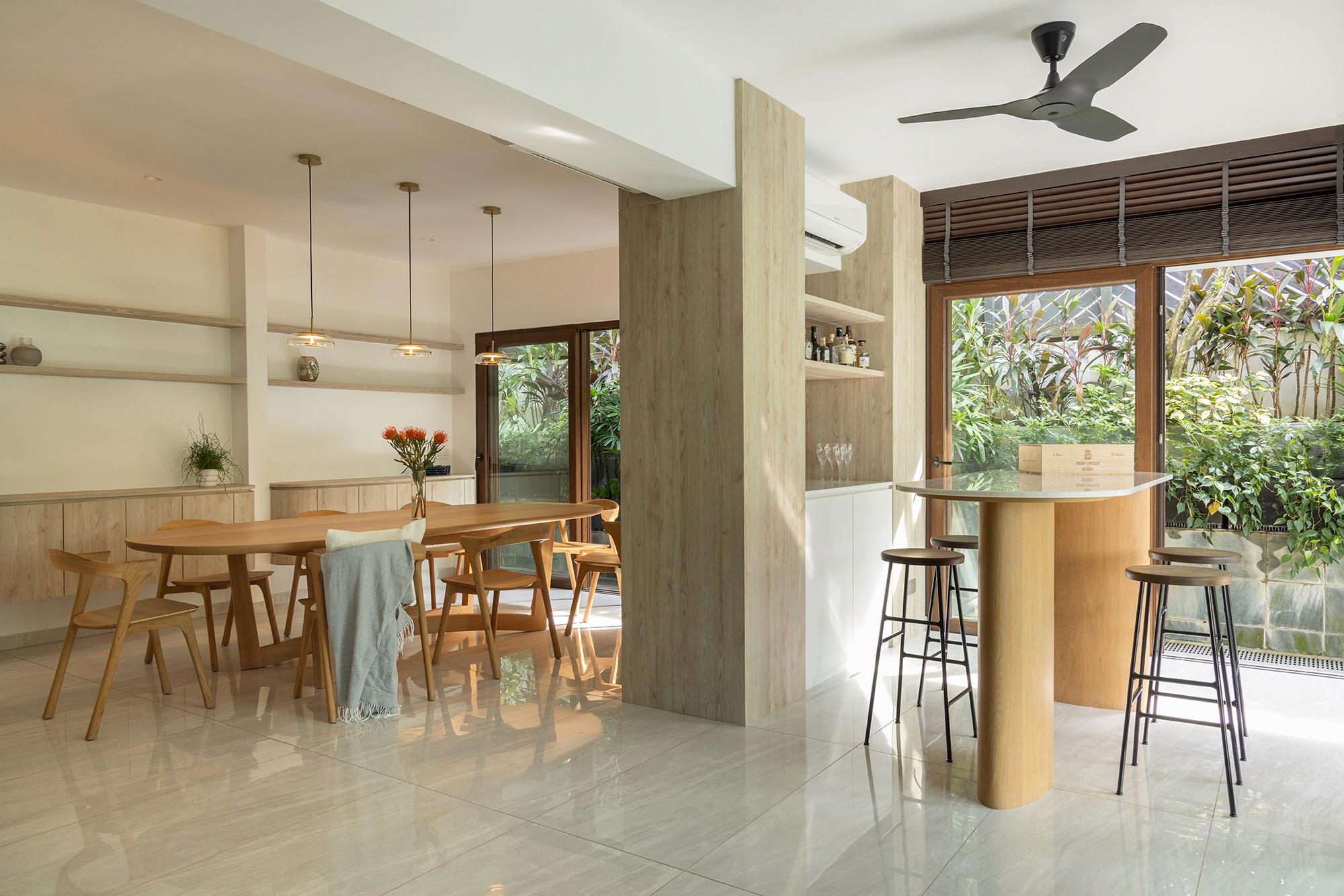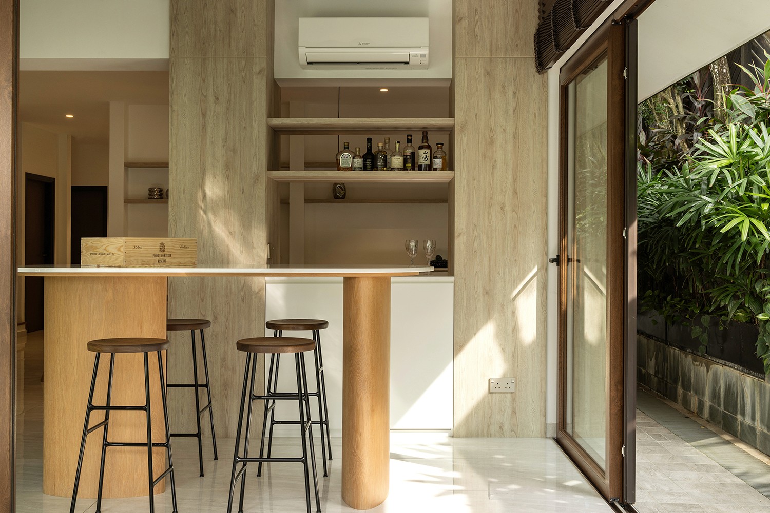 The old two storey terrace house had a disproportionately large front outdoor terrace space which we found to be underutilised. Interestingly the client desired a bar counter space at the front of the house, creating a unique starting point for the project. We internalised the front terrace space and designed a new foyer and bar area that boasts lovely garden views. Between the foyer and living are a set of built-in feature shelves, providing a backdrop for a piano that sits in the living space. The lightness of the screens and bar counter allows direct views through the areas, making them feel like a cohesive space rather than separate rooms. Our favourite corner of the house is where the bar sits, featuring a custom made bar counter crafted by a wood artisan – aglow with light, seamlessly blending the indoors with the outdoors. The house features a muted palette of warm oak, off-whites and soft textures, creating a cosy and inviting retreat.