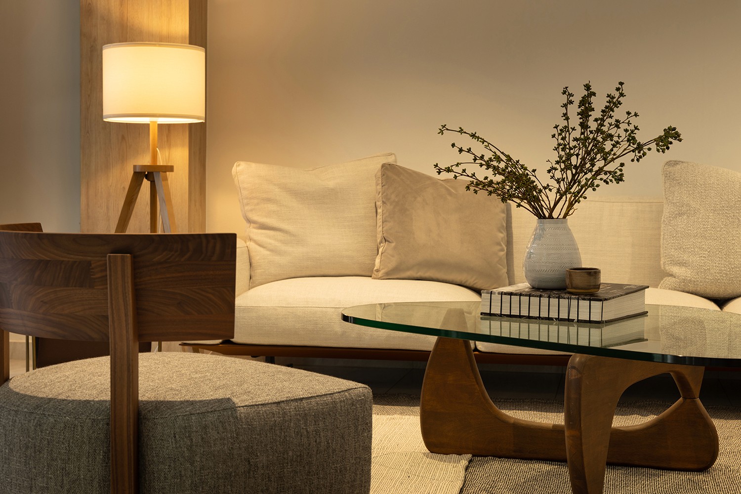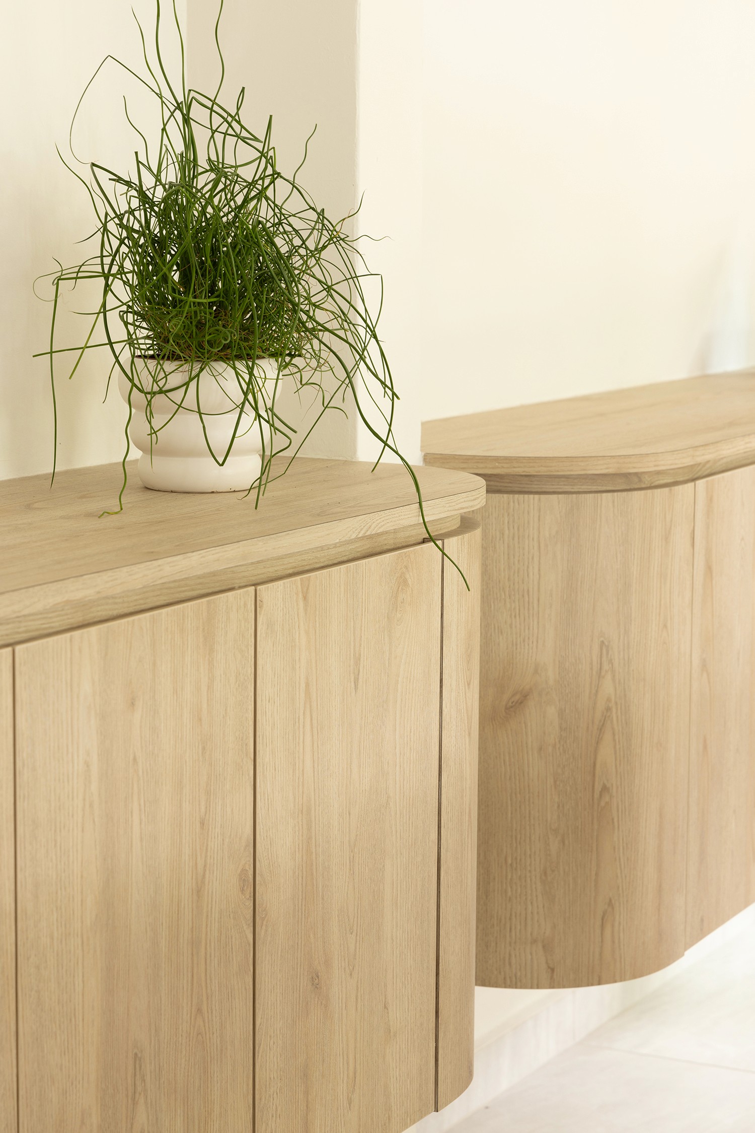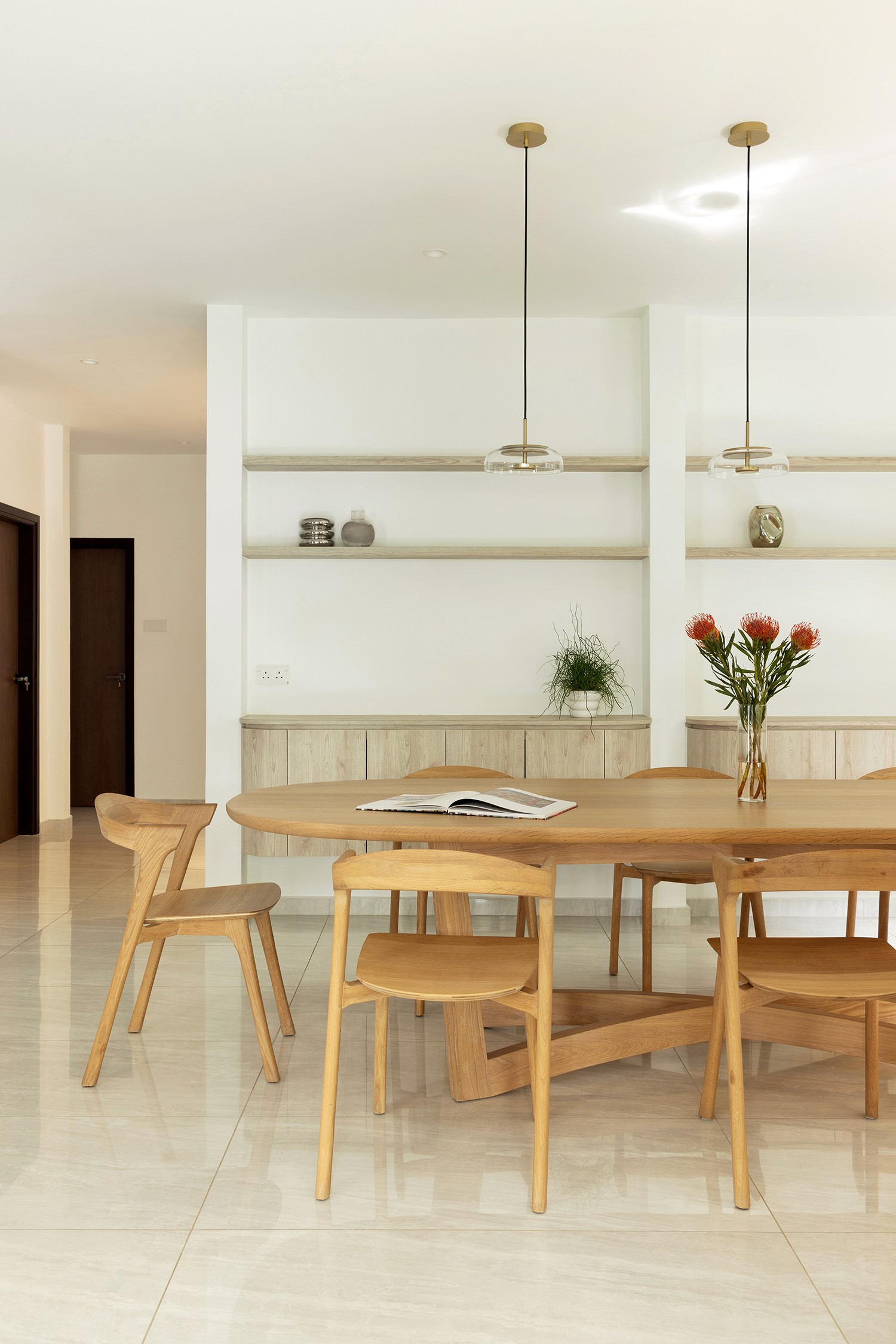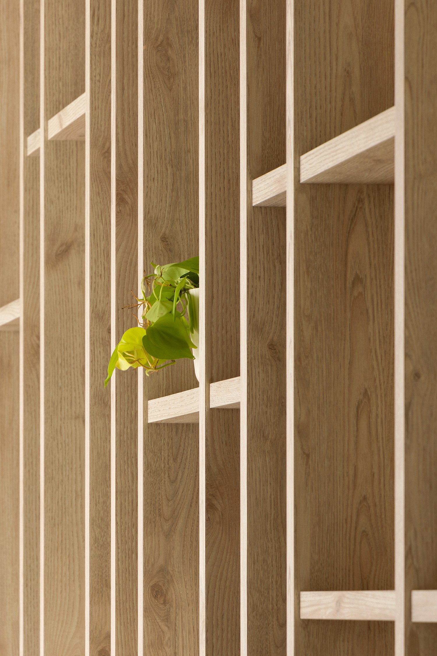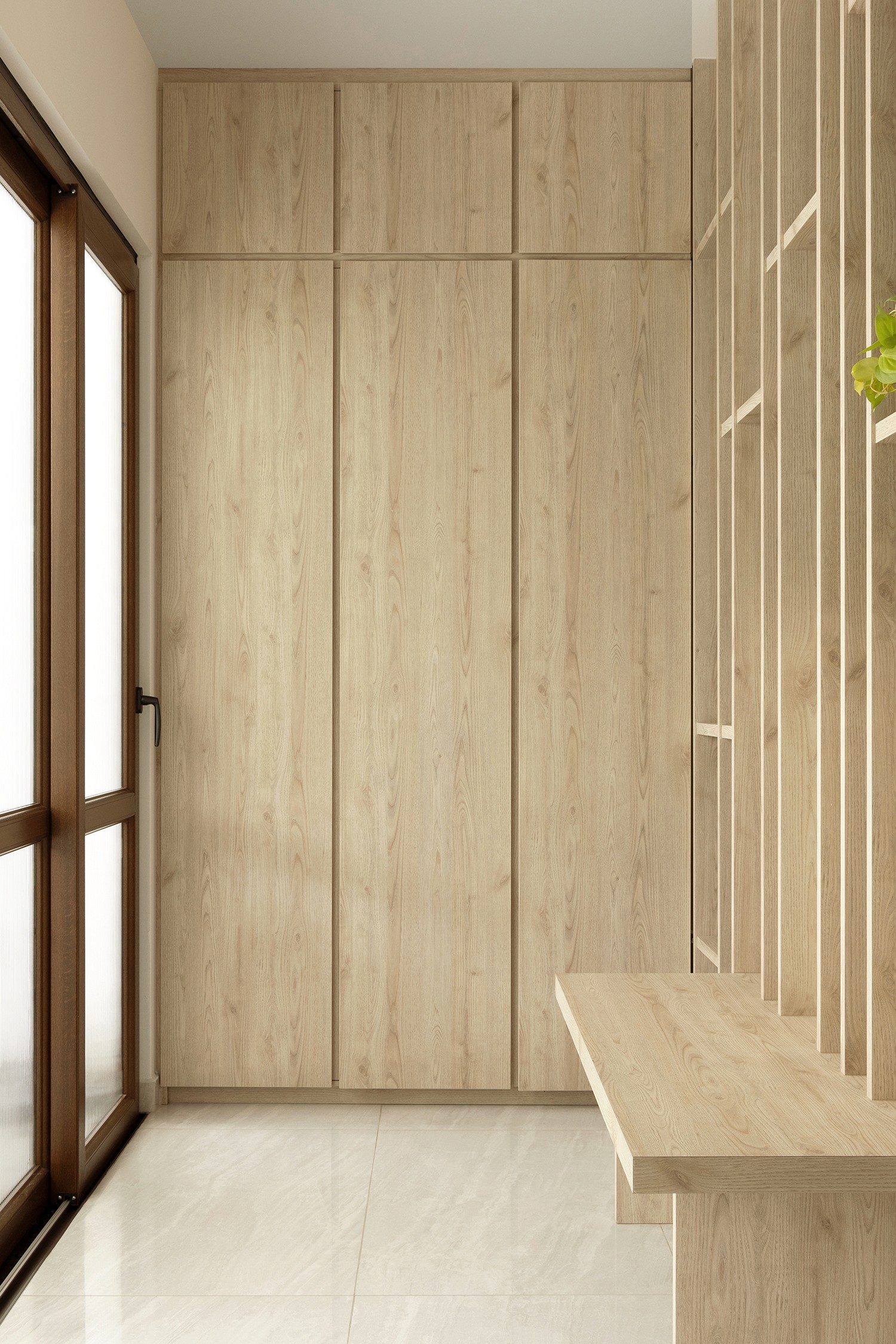 The old two storey terrace house had a disproportionately large front outdoor terrace space which we found to be underutilised. Interestingly the client desired a bar counter space at the front of the house, creating a unique starting point for the project. We internalised the front terrace space and designed a new foyer and bar area that boasts lovely garden views. Between the foyer and living are a set of built-in feature shelves, providing a backdrop for a piano that sits in the living space. The lightness of the screens and bar counter allows direct views through the areas, making them feel like a cohesive space rather than separate rooms. Our favourite corner of the house is where the bar sits, featuring a custom made bar counter crafted by a wood artisan – aglow with light, seamlessly blending the indoors with the outdoors. The house features a muted palette of warm oak, off-whites and soft textures, creating a cosy and inviting retreat.