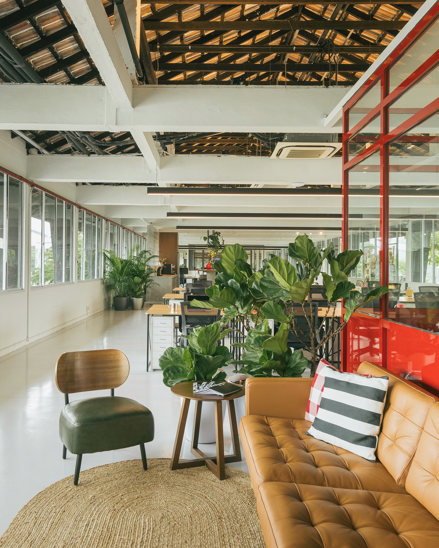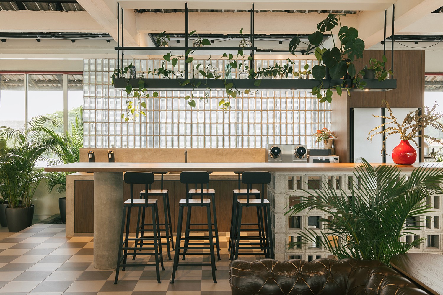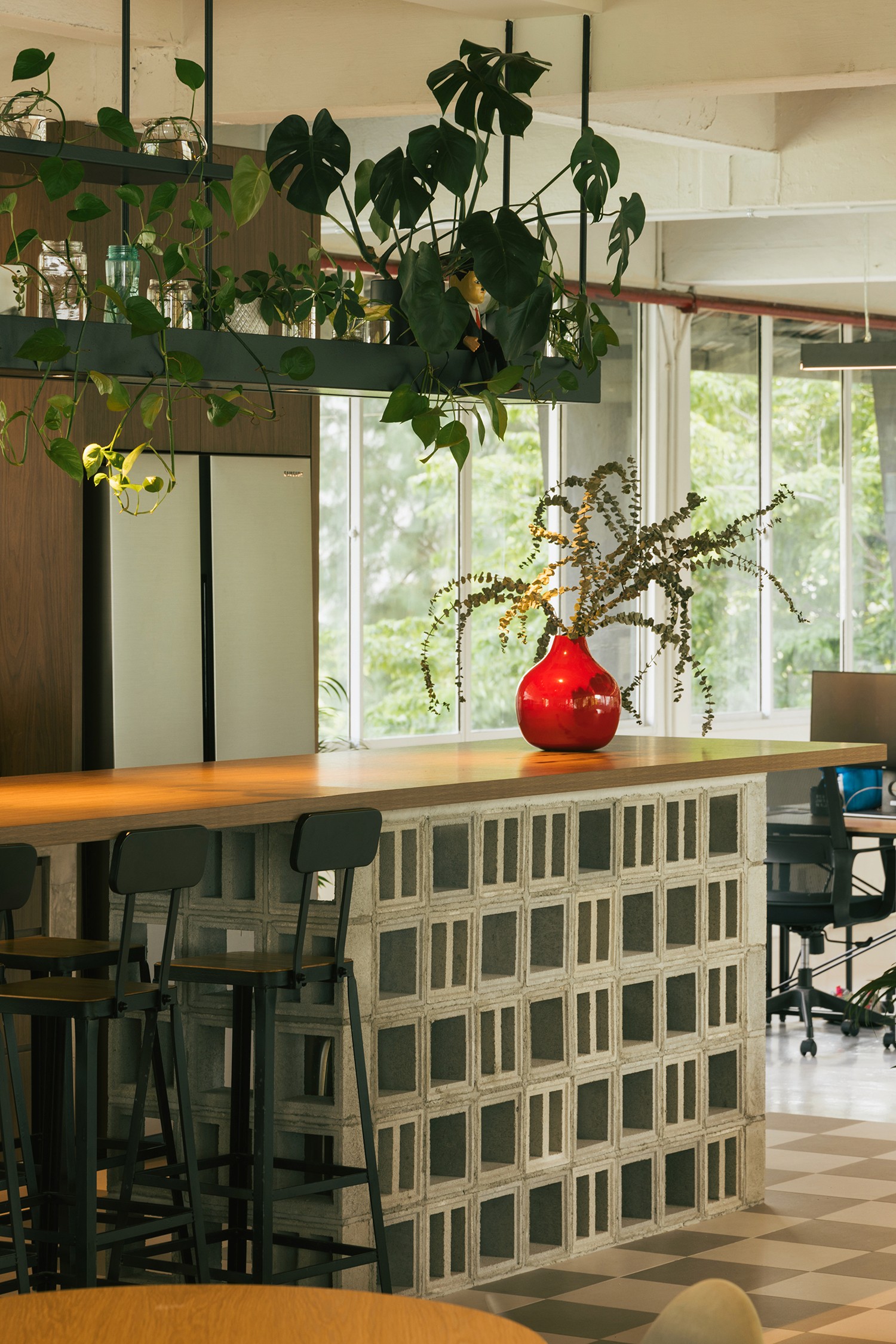 Nestled within a conserved building that once served as a school, this vibrant creative office redefines the traditional workspace. The design invites you into a world of bold patterns, textured natural materials, and lush greenery, combining nostalgia with a playful, contemporary twist. By exposing the original roof structure, the space embraces its tropical heritage, creating soaring ceilings that evoke a sense of expansiveness. Striking design elements —playful patterns, concrete blocks, and red plywood paneling—add energy and character, leaving visitors with a memorable first impression. These features not only reflect the company’s creative identity but also proudly showcase its accolades and style. At the heart of the office lies a statement-making bar. Featuring glass blocks for privacy and natural light alongside textured concrete, it anchors the space while adding visual intrigue. Surrounding it, hanging shelves filled with greenery bring nature indoors, and dynamic floor tiles add layers of depth and liveliness. The layout challenges conventional office design, opting instead for fluid, unconventional meeting areas that inspire collaboration and creativity. This dynamic space is as versatile as it is inspiring, embodying the perfect balance of functionality, innovation, and fun.