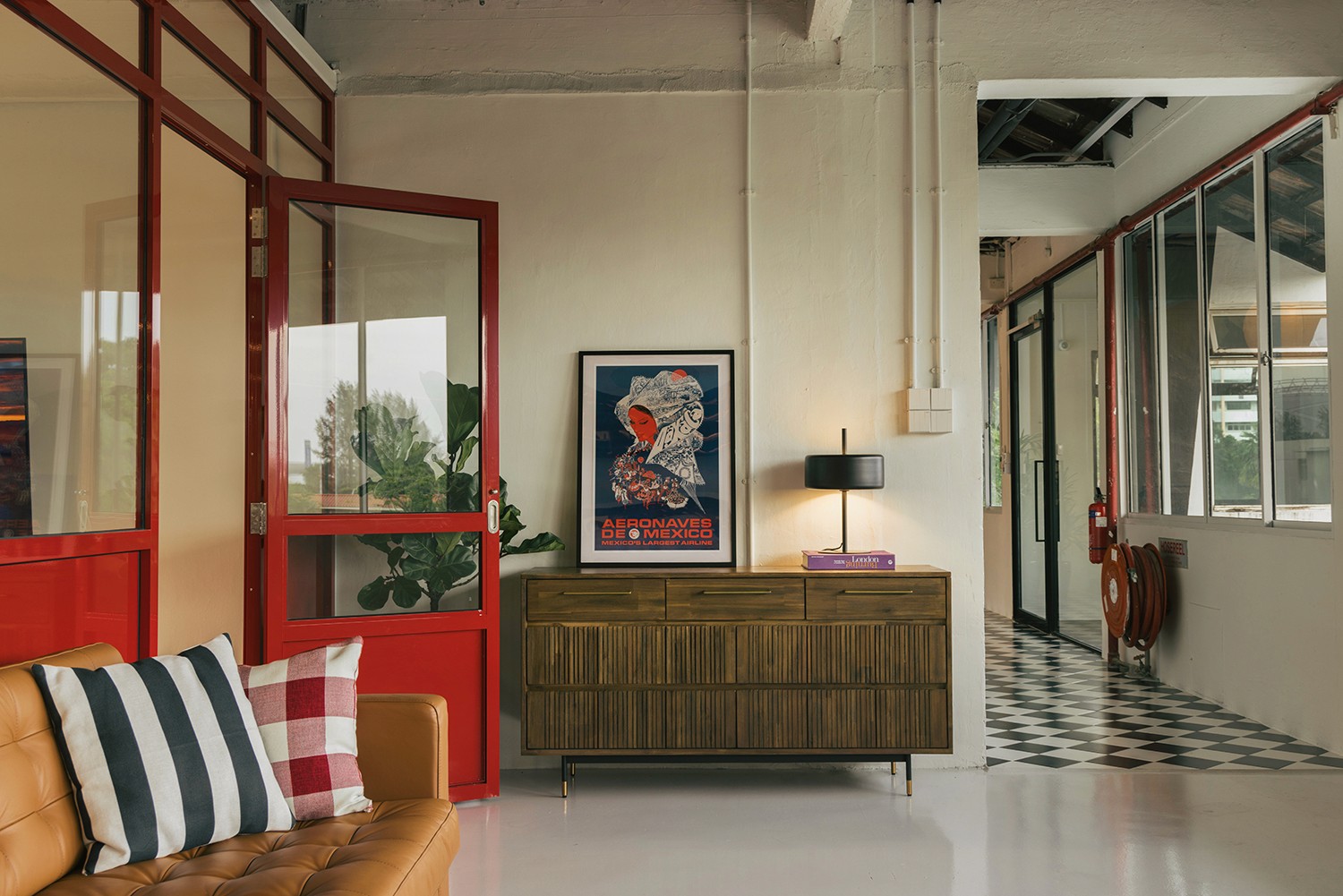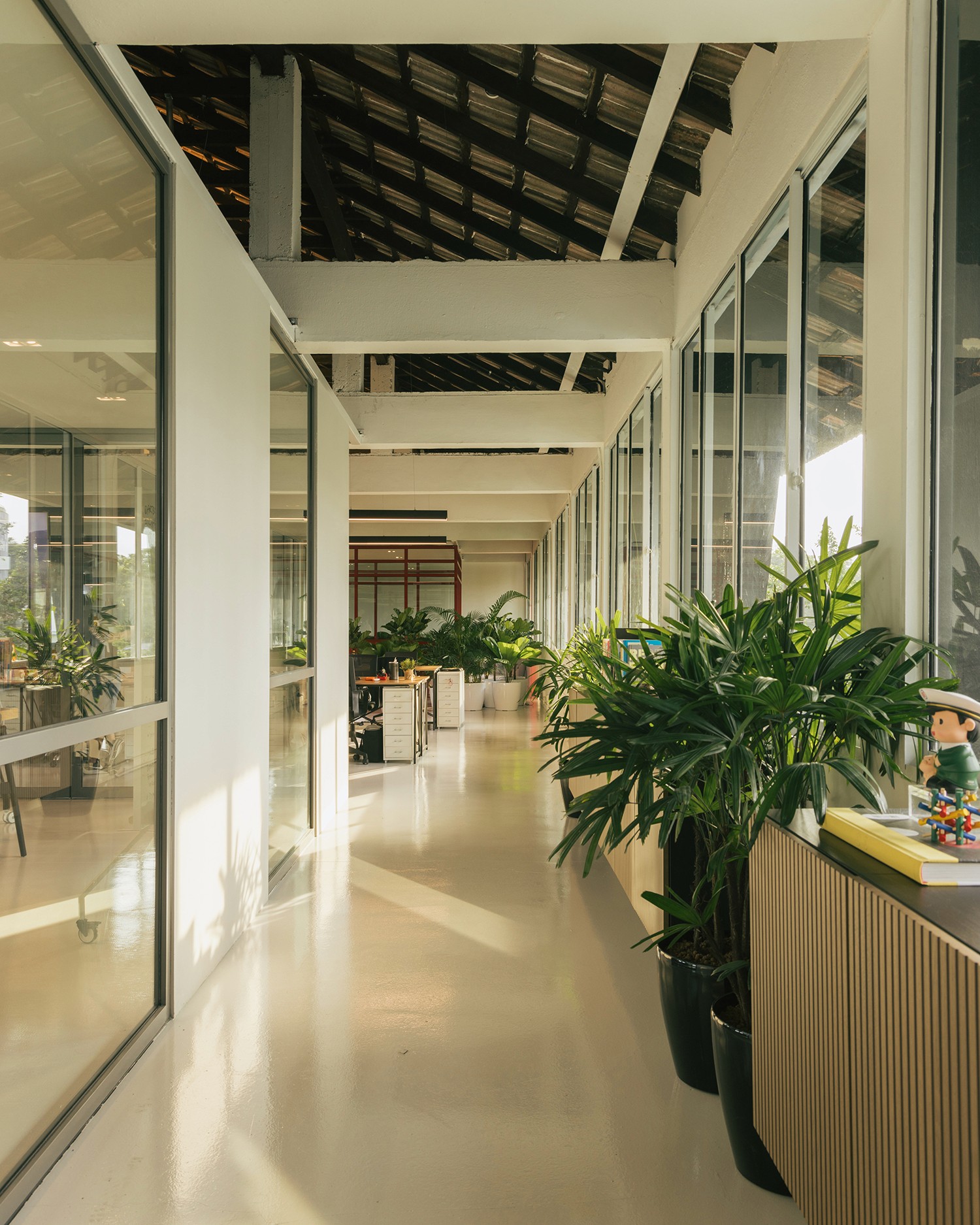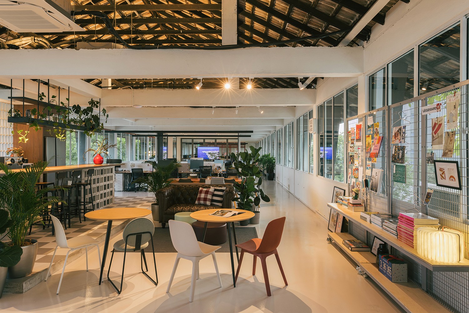 Nestled within a conserved building that once served as a school, this vibrant creative office redefines the traditional workspace. The design invites you into a world of bold patterns, textured natural materials, and lush greenery, combining nostalgia with a playful, contemporary twist. By exposing the original roof structure, the space embraces its tropical heritage, creating soaring ceilings that evoke a sense of expansiveness. Striking design elements —playful patterns, concrete blocks, and red plywood paneling—add energy and character, leaving visitors with a memorable first impression. These features not only reflect the company’s creative identity but also proudly showcase its accolades and style. At the heart of the office lies a statement-making bar. Featuring glass blocks for privacy and natural light alongside textured concrete, it anchors the space while adding visual intrigue. Surrounding it, hanging shelves filled with greenery bring nature indoors, and dynamic floor tiles add layers of depth and liveliness. The layout challenges conventional office design, opting instead for fluid, unconventional meeting areas that inspire collaboration and creativity. This dynamic space is as versatile as it is inspiring, embodying the perfect balance of functionality, innovation, and fun.